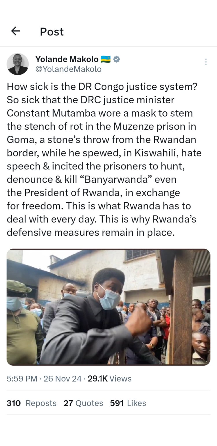 Ati: "Ubutabera bwa RDC burwaye bingana iki? Burarembye ku buryo Minisitiri w’Ubutabera, Constant Mutamba yambaye agapfukamunwa mu rwego rwo kwirinda umunuko wo muri gereza ya Munzenze y’i Goma iri hafi cyane y’u Rwanda, ubwo yarimo asukagura mu giswahili imvugo z’urwango ndetse ashishikariza abagororwa guhiga, kwamagana ndetse no kwica "Banyarwanda" na Perezida w’u Rwanda nk’ingurane yo kugira ngo barekurwe".